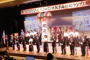 続いて国会議員らの祝辞、国土交通省の河本敦奈良国道事務所長による事業概要説明、地元企業や高校生らが期待のメッセージを発表した後、堀内大和高田市長の発声により出席者全員が万歳三唱を行った。最後に関係者らは壇上でテープカットやくす玉開披などで開通を祝い、京奈和道の全線開通に向け、一致団結していくことを確認した。
