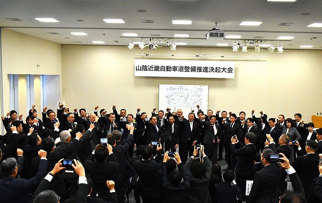 山陰近畿自動車道整備推進決起大会が昨年11月18日、東京・永田町の衆議院第一議員会館で開催された。山陰地方と北近畿地方を繋ぎ、新たな国土軸を担う山陰近畿自動車道の早期完成に向け、地元選出国会議員と沿線自治体、関係者が一致結束して強力に取り組むことを誓い合った。