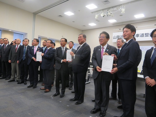 冒頭、石破衆議院議員が「鳥取県、そして兵庫県、京都府と賑わいを取り戻すために頑張る」と挨拶。続いて議連会長の谷衆議院議員が「地域の魅力づくりを進めていくための最低条件が道路整備。山陰近畿自動車道約120㌔の全線開通に向け、ともに頑張ろう」と呼びかけた。