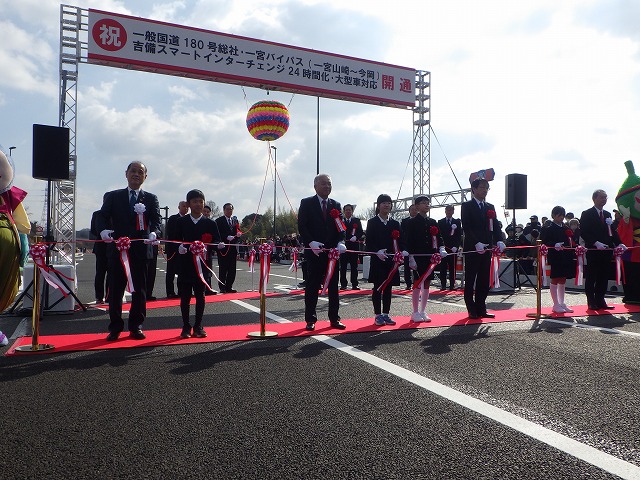 主催者の大森岡山市長は「岡山市にとっては悲願の開通式。このスマートICの完成見越し、周辺には企業立地が進んでいる。アクセス整備、時間はかかるが着々と進めて岡山の良さをさらに出していきたい」と挨拶した。式典終了後、関係者らは同バイパスの開通区間へ移動し、テープカットやくす玉開披、祝賀パレードを行った。