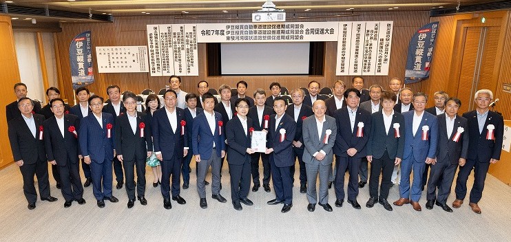 伊豆縦貫自動車道と東駿河湾環状道路の整備促進を目指して活動する静岡県の期成同盟会3団体が18日、東京・平河町の都道府県会館で合同促進大会を開催した。出席者からは、7月30日に発生したカムチャツカ半島付近の地震による津波警報を振り返り、安全な場所への迅速な避難を可能とする半島中央部の「命の道」整備を求める声が集中。来賓・関係者約150人が早期事業化と予算確保へ心を一つにした。