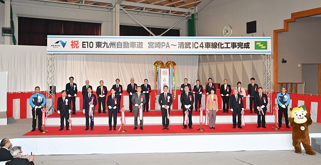 東九州自動車道・宮崎PA~清武IC間(延長3・7㌔)の4車線化が完成し20日、NEXCO西日本と宮崎県共催による記念式典が旧宮崎市立生目台西小学校体育館で開かれた。同道の4車線化は、宮崎県内では初。会場には地元選出国会議員や関係者ら約120人が出席。来賓からは防災・減災を支える強い道の「その先」に大きな期待が寄せられた。