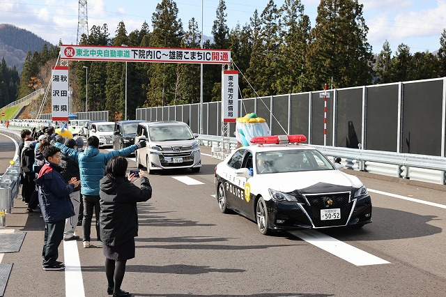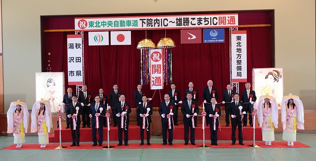 当日、湯沢市立雄勝中学校体育館で開通式が行われた。登壇した鈴木健太秋田県知事は「今回の開通により、大規模災害時における代替ルートが確実に形成され、安全で安心な道路交通が確保される。あわせて企業の設備投資の拡大や、地場産品・工業生産品の輸送効率化が図られ、地域の更なる発展に大きく寄与するものと確信している」と挨拶。「山形県境が間近に迫ってきた。この先の事業中区間の早期完成、県勢発展に資する高速道路ネットワーク整備に必要な予算の確保等に向け全力で取り組む」と語った。