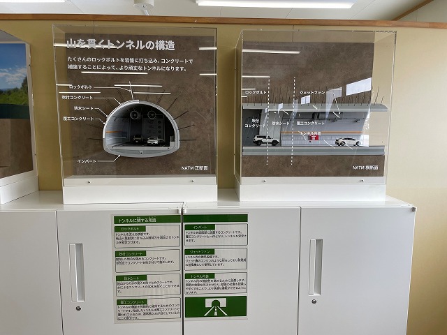 「おとふけBASE」では、道東道4車線化事業の概要や4車線化による整備効果、事業区間の立体地図模型、建設予定の橋梁やトンネルの小型模型を展示。
