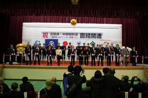 午前十時から、松岡IC近くの永平寺町立松岡中学校体育館で、西川一誠福井県知事をはじめ、福井県選出国会議員、県議会議員沿線首長ら関係者約260人が出席し、開通式典が行われた。西川知事は「2年後の平成28年度には大野市内までの全線が開通する。北陸新幹線敦賀開業にあわせた中部縦貫自動車道の県内区間全線開通が実現できるよう、一層のご支援と協力をお願いする」と挨拶。関係者らと松岡中学校の生徒らは、テープカットを行い、県内のより一層の経済活性化や観光振興が期待される高速道路の開通を祝った。